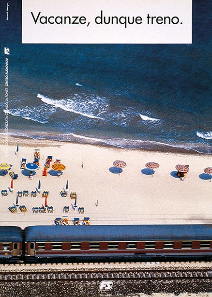 POSTER FOR THE ITALIAN NATIONAL RAILWAY PROMOTING THE USE OF THE TRAIN FOR VACATION